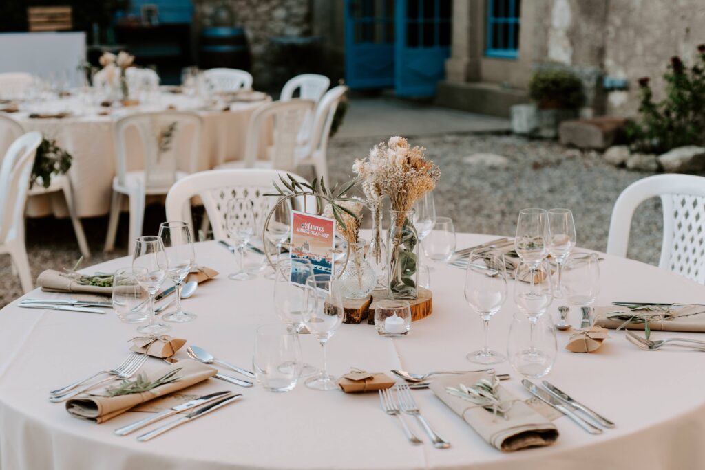 En partenariat avec des traiteurs, DJ et photographes, nous vous accompagnons pour organiser un événement sur-mesure, à votre image. Pour un mariage, la location du Préau, de la cour, de la Salle du Lustre et de la Salle du Chai est proposée à partir de 2 560 €, incluant les tables et chaises ainsi que l’installation la veille. L’ensemble du domaine peut également être privatisé pour un événement entièrement exclusif.